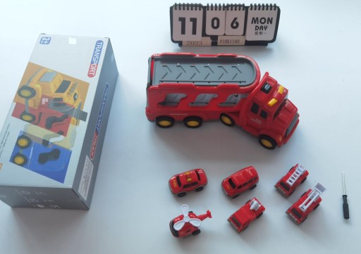 🚒Zaprojektowany dla małych entuzjastów strażaków, zawiera większy pojazd transportowy i 6 małych samochodów (samochód strażacki, ciężarówka z drabiną, helikopter, ciężarówka zraszająca, samochód i SUV).
