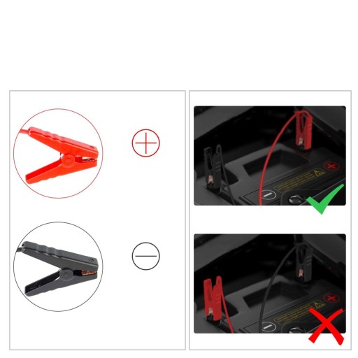2. Przymocuj czerwony zacisk do dodatniego ( ) bieguna akumulatora, a czarny zacisk do ujemnego (-) bieguna akumulatora i uruchom samochód.
