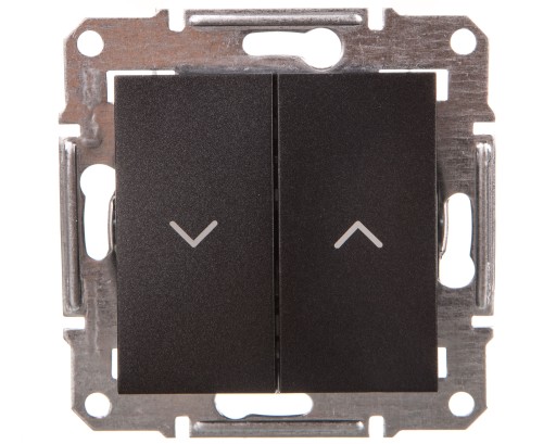 Przycisk żaluzjowy w kolorze grafitowym, serii Asfora, marki Schneider Electric, o numerze katalogowym EPH1300371. Podłączenie przewodów za pomocą zacisków śrubowych. Długie i solidne pazury utrzymywane są za pomocą metalowych prowadnic w pozycji pionowej, co ułatwia montaż oraz zwiększa bezpieczeństwo podczas mocowania mechanizmu w puszce instalacyjnej. Mechanizm posiada czytelny schemat oraz oznaczenie zacisków ułatwiające podłączenie. Dodatkowo, solidna ramka montażowa wykonana z galwanizowanego metalu posiada nacięcia ułatwiające pozycjonowanie. Produkt może być instalowany w ramkach wielokrotnych.