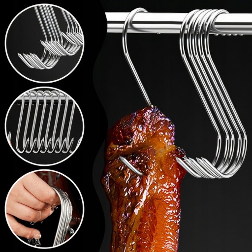 Zestaw 15 haczyków typu S do zawieszenia mięsa w wędzarniach. Wytrzymałość każdego haka jest dostosowana do większych kawałków mięsa. Każdy z haków został dodatkowo zaostrzony co ułatwia zagłębienie go w mięsie. Konstrukcja ze stali nierdzewnej zapewnia wysoką trwałość i jest łatwa w czyszczeniu.