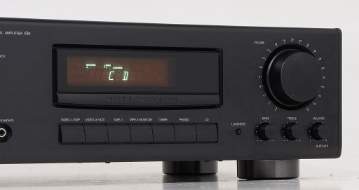 A-RV410 to świetnie dopracowany pod względem technicznym jak i wizualnym model który od lat cieszy się bardzo dobrą opinią. Od przodu aluminiowy front panel z ergonomicznie rozmieszczonymi potencjometrami regulacji Bas, Treble, Balance, ogromną gałką Volume umieszczoną centralnie, funkcją umożliwiającą pominięcie regulacji tonów Source Direct, przełącznikami wejść, obrotowym przełącznikiem zestawów kolumn A, B, A+B, wejściem RCA, wyświetlaczem informującym o wybranym źródle dźwięku i funkcji, oraz wyjściem słuchawkowym. Z tyłu wejścia/wyjścia RCA/Cinch - gramofonowe PHONO, CD/DVD, TUNER, VCR-2/AUX, TAPE-1/DAT , TAPE-2/MD, solidne zakręcane terminale głośnikowe umożliwiające podłączenie 4 kolumn A,B, A+B mogących pracować razem lub osobno. W środku znakomita firmowa konstrukcja – końcówka mocy oparta o potężne tranzystory sankena z tzw. „skrzydełkami” zamocowane na dużym radiatorze, wielkie kondensatory filtrujące Nichicon Black Negative o łącznej pojemności 20 000 uF, potencjometry firmy Alps, całość wspierana potężnym transformatorem!!!
