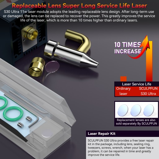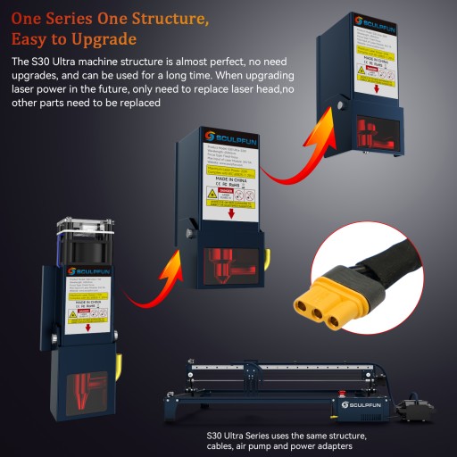 Ulepszone trzy opcje lasera 11W, 22W, 33W: Laser serii S30 Ultra wykorzystuje pojedynczą ulepszoną diodę 6W, co zwiększa jego rzeczywistą moc lasera i możliwości cięcia, a także zapewnia trzy opcje lasera 11W/22W/33W.