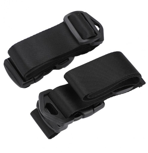 Dodatkowo na zakończeniu pasków do noszenia nart zostały wszyte specjalne uchwyty, przez które można zawiesić kask lub przełożyć kijki.