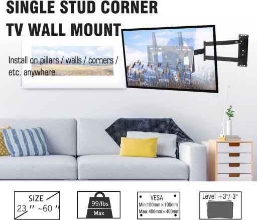 - Pojedynczy uchwyt na telewizor z pojedynczą konstrukcją: ten jedyny w swoim rodzaju uchwyt pełnoruchowy oznacza, że wystarczy tylko znaleźć JEDEN kołek, aby cieszyć się wszystkimi niesamowitymi funkcjami związanymi z montażem na rogu. Po co wiercić dwa razy, jeśli można je wiercić? Pracuj mądrzej, nie mocniej, gang.