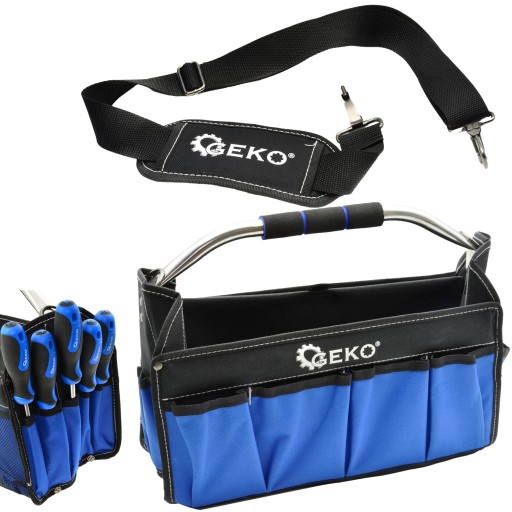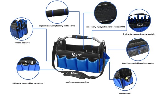 Oferowana torba ma otwartą konstrukcję, dzięki czemu pozwala na szybkie i łatwe sięganie po potrzebne narzędzia. Dodatkowo, została wyposażona w regulowany pasek na ramię oraz metalowy uchwyt transportowy, który pokryto miękką gąbką. Dzięki takim rozwiązaniom torba jest bardzo wygodna podczas przenoszenia!
