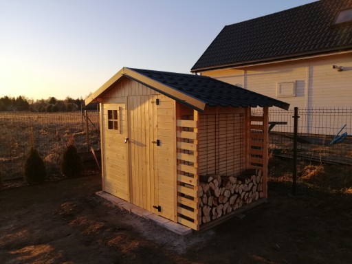 Możliwe wykonanie drewutni 70 cm - dopłata 150 zł (w przypadku zakupu gontu bitumicznego do domku z drewutnią 70 cm, koszt gontu wzrasta o 50 zł).