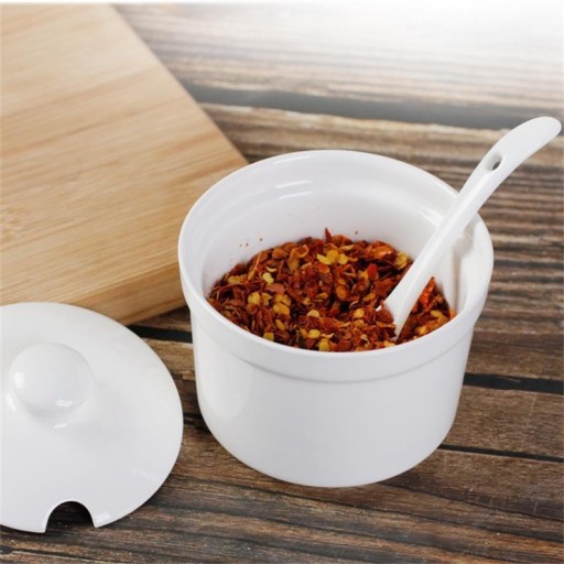 Керамическая сахарница для сахара и специй с крышкой и белой ложкой.