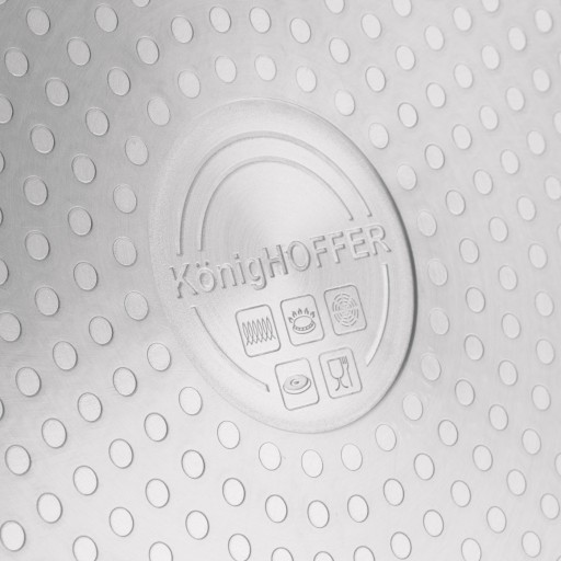 Zestaw garnków Konighoffer Jukon 10 elementów wykorzystuje powłokę non-stick ułatwiającą pielęgnację (nie do zmywarki, tylko mycie ręczne). Komplet jest solidny i pozwala na bezpieczne gotowanie oraz smażenie, zmniejszając ryzyko oparzenia dłoni. W zestawie znajdziesz naczynia o pojemności od 1,2 do 6,5 litra. Do garnków dołączono szklane pokrywki ze stalowym rantem, chroniącym przed wyszczerbieniem. Mają one również stylowe uchwyty soft touch, które się nie nagrzewają i nie ślizgają w dłoni. Z kompletem garnków i 2 patelni Jukon możesz gotować na każdym typie kuchenki. Elegancji dodaje mu marmurowa powłoka nieprzywierająca, która wytrzyma wiele cykli ścierania (5000!) oraz wykończenie aluminiowych korpusów kutych w wysokiej temperaturze. Nagrzewają się szybko, a więc oszczędzisz czas i energię. Świetnie sprawdzą się w rodzinnej kuchni lub jako prezent. Są też dobrze zabezpieczone przed wysoką temperaturą i równomiernie przewodzą ciepło. Zapewniają pewny chwyt podczas przenoszenia. O ich bezpieczeństwie użytkowania oraz nietoksycznej konstrukcji dla środowiska stanowi oznaczenie PFOA Free.