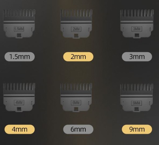 - Nasadki grzebieniowe w zestawie: 1,5mm, 2mm, 3mm, 4mm, 6mm, 9mm