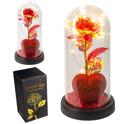 WIECZNA RÓŻA z sercem i napisem Kocham Cię W KAPSULE ŚIECI ŚWIATŁEM LED.