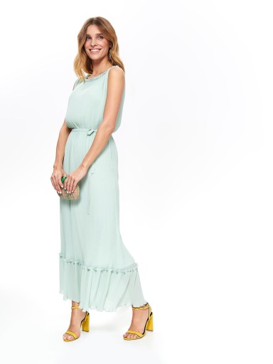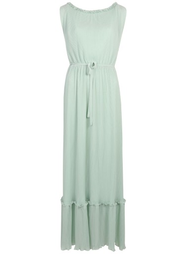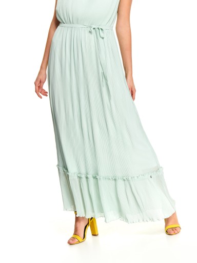 Długa, elegancka sukienka wykonana z lejącego się materiału o prążkowanej fakturze. Sukienka bez rękawków, przy dekolcie ozdobiona falbanką, w pasie wiązana. Idealna na wyjątkowe okazje, sukienka dostępna w kolorze jasnozielonym.