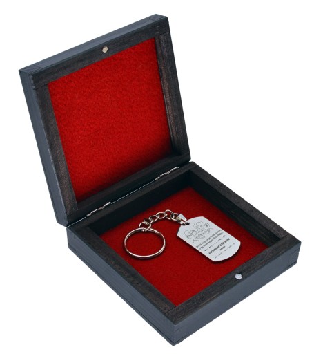 - Gotowy Upominek: Brelok jest dodatkowo pakowany w eleganckie drewniane pudełko prezentowe, wykończone w środku miękkim filcem, co sprawia, że nadaje się idealnie jako gotowy upominek do wręczenia. Jego wymiary to 10.5 x 10.5 x 3.5 cm.