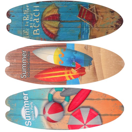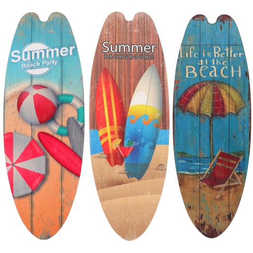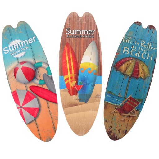 ZESTAW 3 DREWNIANYCH TABLIC DEKORACYJNYCH Z MOTYWEM DESKI SURFINGOWEJ - IDEALNE DO OZDOBY BARU LUB IMPREZY PLAŻOWEJ.