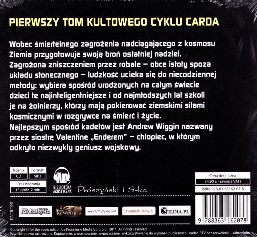 PIERWSZY TOM KULTOWEGO CYKLU CARDA Wobec śmiertelnego zagrożenia nadciągającego z kosmosu Ziemia przygotowuje swoją broń ostatniej nadziei. Zagrożona zniszczeniem przez robale - prawdopodobne, obce istoty spoza układu słonecznego - ludzkość ucieka się do niecodziennej metody: wybiera spośród urodzonych na całym świecie dzieci te najinteligentniejsze i od najmłodszych lat szkoli je na żołnierzy, którzy mają pokierować ziemskimi siłami kosmicznymi w rozgrywce o śmierć i życie. Najlepszym spośród kadetów jest Andrew Wiggin nazwany przez siostrę Valentine "Enderem" - chłopiec, w którym odkryto niezwykły geniusz wojskowy. Czas nagli, a przyszłość dwóch cywilizacji spoczywa w rękach dziecka? Czyta Roch Siemianowski