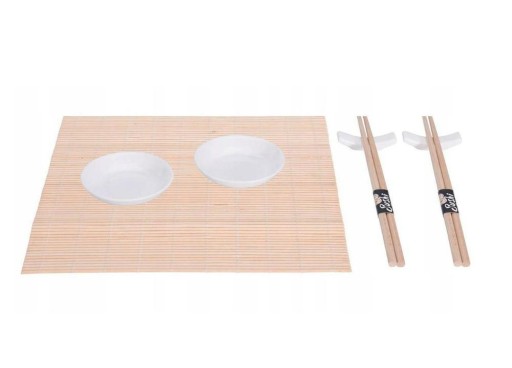 Kompletny zestaw do sushi 7 elementowy dla dwóch osób. Mata do sushi i pałeczki wykonane zostały z drewna bambusowego.