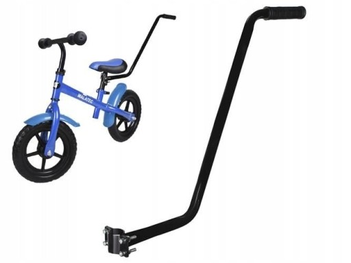 Metalowy uchwyt z rączką, montowany do wspornika siodełka pozwala na wygodną asekurację dziecka w łapaniu równowagi na rowerku.