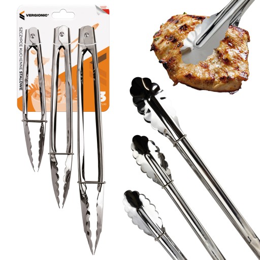 Co więcej, doskonale sprawdzą się do nakładania i mieszania sałatek. W zestawie znajdują się szczypce w trzech różnych rozmiarach – 18 cm, 22 cm, 28 cm. Każde z nich mają specjalnie wyprofilowane końcówki ułatwiające chwytanie oraz blokadę chroniącą przed rozkładaniem.