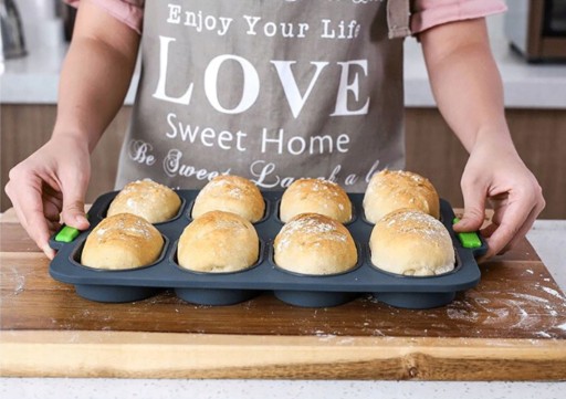 - Forma silikonowa do wielokrotnego użytku. Możesz w niej upiec 8 sztuk bułeczek.