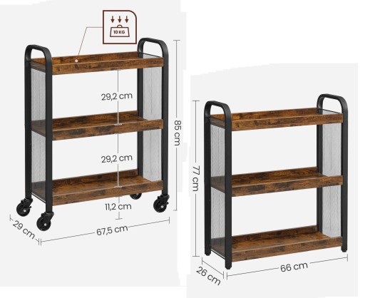 Wózek wykonany w stylu rustykalnym, czyli odpowiednio stylizowanym na wiekowy. Rewelacyjna mobilna szafka na kółkach idealna do kuchni, spiżarni, a nawet sypialni i biura. Szafka została stworzona tak, aby zagospodarować wąskie przestrzenie oraz ułatwić dostęp do najczęściej używanych produktów. Dzięki niej zyskujemy dodatkową przestrzeń, pomaga nam również utrzymać porządek w domu.