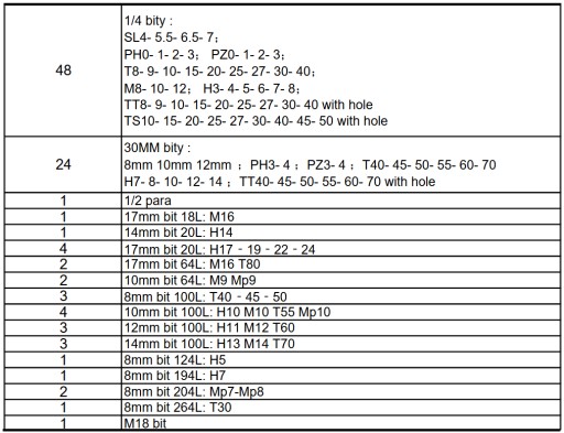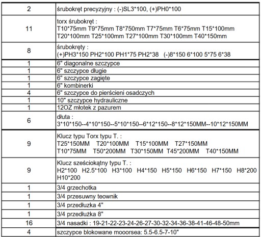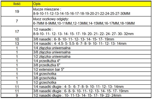 Zawartość szuflad: