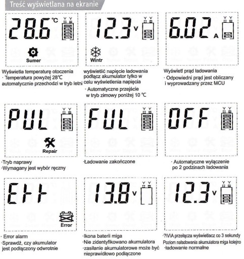 - Obsługiwane typy akumulatorów: samochodowe, motocyklowe, AGM (z systemem START-STOP)