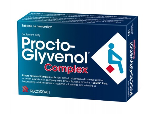 Procto-Glyvenol Complex, suplement diety w postaci tabletek na hemoroidy. Zawiera wyjątkową postać diosminy - µSMIN® Plus. Ekstrakt z ruszczyka kolczastego wspomaga prawidłowe krążenie żylne. Witamina C wspomaga w prawidłowej produkcji kolagenu w celu zapewnienia prawidłowego funkcjonowania naczyń krwionośnych.