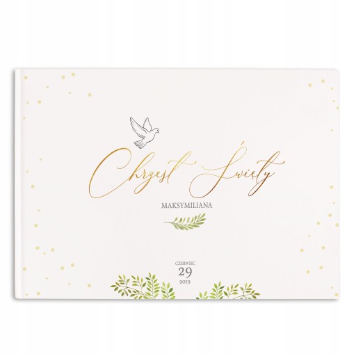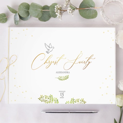 - Księga pamiątkowa w białym kolorze. Na powierzchni znajduje się piękna grafika.
