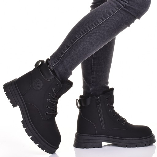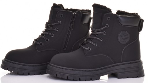 Obuwie wykonane zostało ze skóry ekologicznej matowej czarnej. Wnętrze ocieplone zostało bardzo gęstym, ciepłym futerkiem.