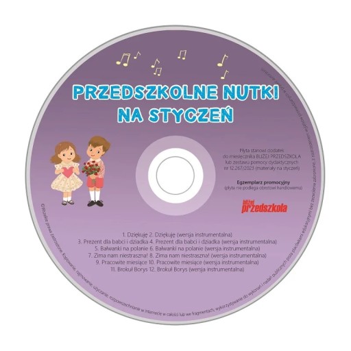 - płytę CD „Przedszkolne nutki na styczeń” z podkładami i piosenkami w wersji wokalnej i instrumentalnej skorelowanymi z treścią miesięcznika;