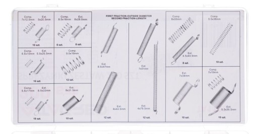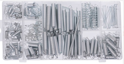 Praktyczny zestaw 200 sprężynek ściągających i rozciągających niezastąpiony w warsztacie samochodowym, w rolnictwie i przemyśle. Praktyczny organizer pozwala na łatwy dostęp do dogodnego rozmiaru.