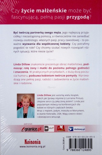 Czy życie małżeńskie może być fascynującą, pełną pasji przygodą? Być twórczą partnerką swego męża, jego najlepszą przyjaciółką i niezastąpioną pomocą, a równocześnie nie zaniedbać rozwoju osobistego, własnych pasji, pracy zawodowej - to poważne wyzwania dla współczesnej kobiety. Czy potrafimy pogodzić te role? Czy chcemy szukać nowych rozwiązań różnych sytuacji, które niesie życie? Linda Dillow znakomicie prezentuje obraz małżeństwa, podnosząc rolę żony i matki do poziomu pełnego godności i znaczenia. W praktycznych przykładach, z dużą dozą poczucia humoru, podsuwa kobietom twórcze pomysły, które mogą wprowadzić w życie małżeńskie i rodzinne pełnię pasji, radości i zadowolenia.