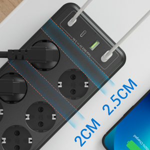 - Ta listwa zasilająca USB oferuje 2 wyjątkowo szerokie gniazda, dzięki czemu możesz używać dużego adaptera bez zajmowania sąsiednich gniazd.
