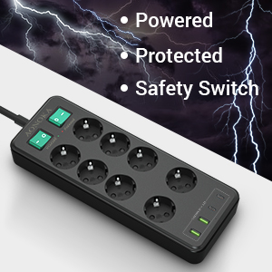 - Ochrona przeciwprzepięciowa listwy zasilającej do 1700 dżuli: 2 wskaźniki LED specjalnie zaprojektowane do ochrony odgromowej w celu ochrony przeciwprzepięciowej i ochrony uziemienia, wbudowany warystor tlenku metalu (MOV) może pochłaniać nadmiar energii, zapobiegając skokom napięcia i pośrednim uderzeniom pioruna, które wpływają na cenny sprzęt elektroniczny podczas ulewnego deszczu i uderzeń piorunów.