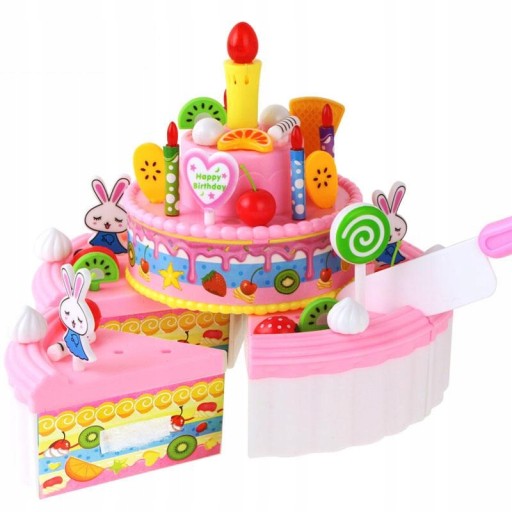 Duży piętrowy tort. Dziecko może samodzielnie "pokroić" tort znajdującym się w zestawie plastikowym nożem. Kawałki tortu łączone są ze sobą rzepami, tym sposobem dziecko może go dzielić i zaraz potem znowu łączyć . Po naciśnięciu świeczki odtwarzana jest muzyka Happy Birthday