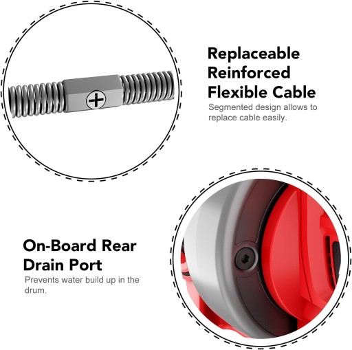 wzmocniony elastyczny kabel o długości 25 stóp (7,5 mm) Można go wymieniać! Z łatwością usuwa zatory z odpływów o szerokości od ¾ do 2 cali, w tym zlewów, toalet i wanien. Zasilany mechanizm podawania do przodu i do tyłu sprawia, że kabel jest automatycznie odprowadzany w dół lub do tyłu, a ustawienie blokady kabla utrzymuje kabel na miejscu podczas usuwania mocnych chodaków.