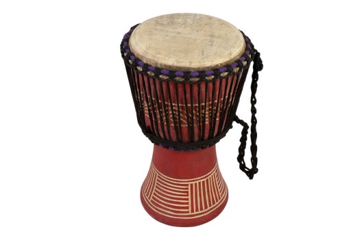 Oryginalny, afrykański bęben Djembe 7" ( średnica górnego naciągu około 7 cali ). Ręcznie wykonany w Ghanie z lokalnego drewna Mansonia. Naciąg z prawdziwej koziej skóry - sznurowany do korpusu. Podane w calach średnice są przybliżone - nie są komputerowo wycinane na podstawie szablonu i zależą od średnicy pnia drzewa, z którego wyżłobiono kadło. Zewnętrzna część jest ozdobiona rzeźbionym ręcznie wzorem.