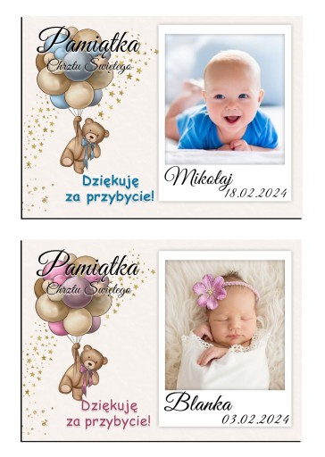 Podziękowania na chrzest, roczek, urodziny od chłopca lub dziewczynki, pamiątka dla gości w kształcie prostokąta ze zdjęciem Twojego dziecka oraz imieniem i datą.