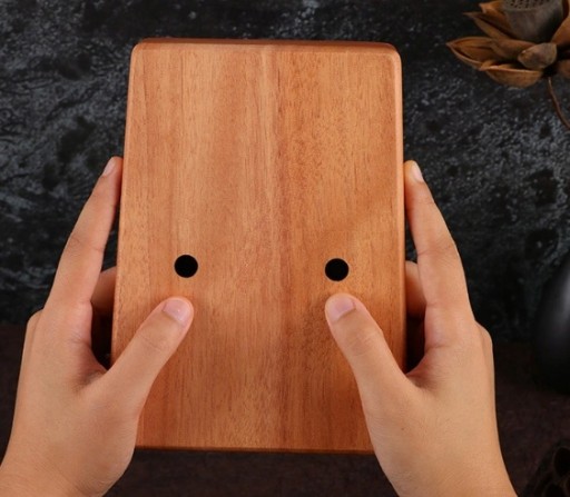 Drewniana obudowa zaopatrzona jest w otwory, działa jak pudło rezonansowe - wykorzystując tę właściwość możesz tworzyć nowe brzmienia przytykając otwory.