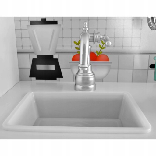 Wielofunkcyjna, duża kuchnia gwarantuje wielogodzinną zabawę. Rozbudowany mebelek z blatem, półkami, szafkami, palnikami, zlewem z kranem, mikrofalą, piekarnikiem oraz dużą lodówką umożliwia niezwykle ciekawą, znakomitą zabawę. Ruchome elementy w postaci otwieranych drzwiczek, wyjmowanego zlewu oraz pokręteł, które pstrykają, są dodatkowym urozmaiceniem. Lodówka posiada imitację dystrybutora wody. Zestaw został wyposażony w niezbędne, drewniane akcesoria kuchenne oraz garnki i telefon ze słuchawką. Produkt odznacza się wyjątkowo atrakcyjnym wyglądem. Staranne wykonanie wraz z estetycznym wykończeniem z dbałością o najmniejsze detale, dodaje walorów i jest przyjemne dla oka. Biały, elegancki kolor oraz dekoracyjne nóżki sprawiają, że kuchnia z powodzeniem może stanowić piękną ozdobę pokoju dziecięcego.