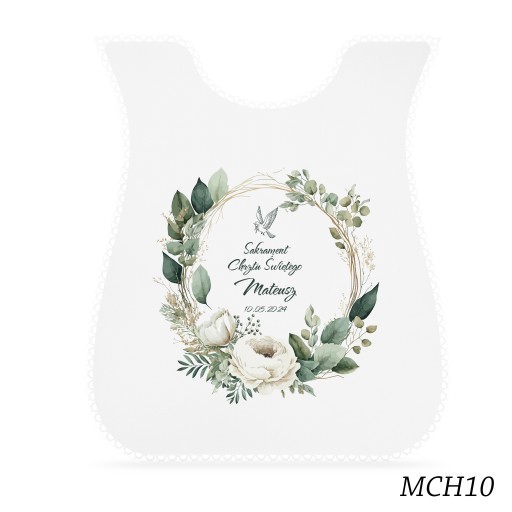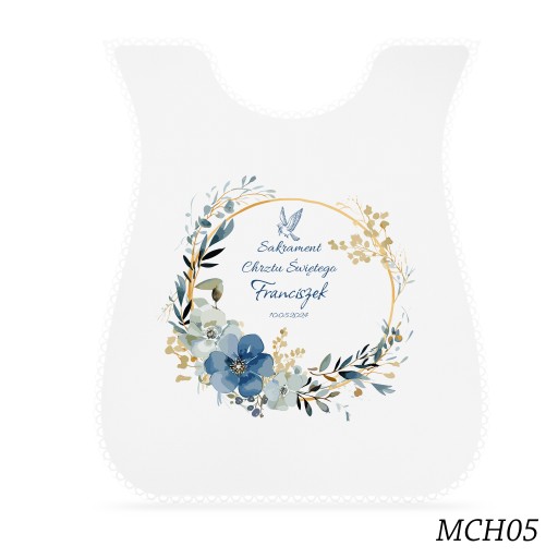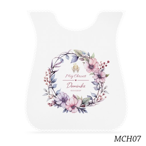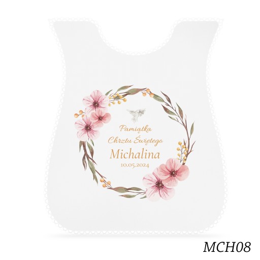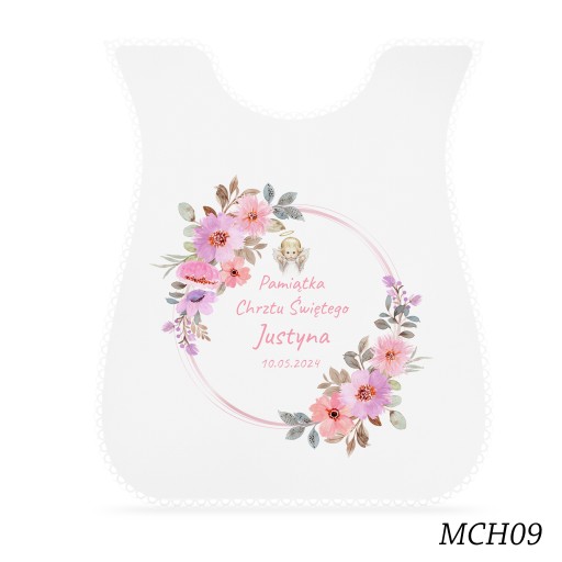 Piękny motyw kwiatowe idealnie współgra z imieniem dziecka oraz datą na szatce.
