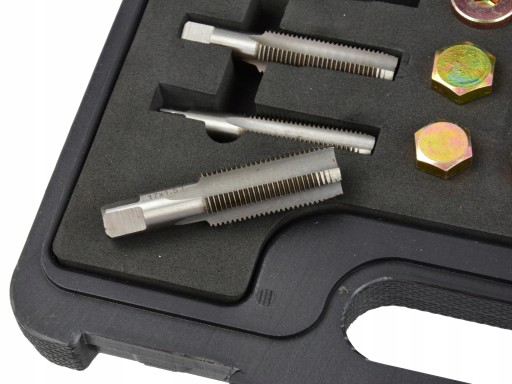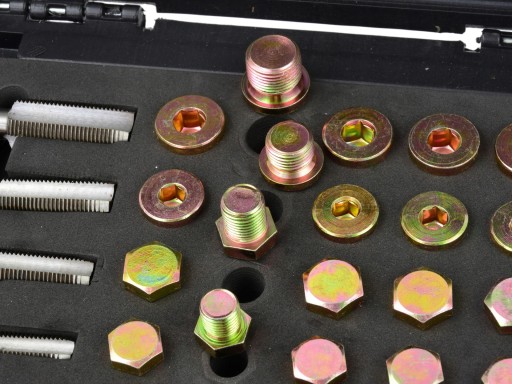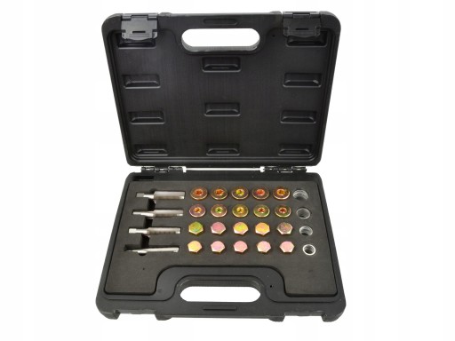 64 elementowy zestaw naprawczy korków do miski olejowej. Zawartość zestawu 4 gwintowniki: M13 x 1,5 mm, M15 x 1,5 mm, M17 x 1,5 mm, M20 x 1,5 mm 5x korek do miski olejowej M13 x 1,5 mm, zewnętrzny hex 17mm 5x korek do miski olejowej M15 x 1,5 mm, zewnętrzny hex 19mm 5x korek do miski olejowej M17 x 1,5 mm, wewnętrzny hex 8 mm 5x korek do miski olejowej M20 x 1,5 mm, wewnętrzny hex 10 mm 50x aluminiowy pierścień uszczelniający, po 10 sztuk o średnicach: 13, 15, 17, 20 mm
