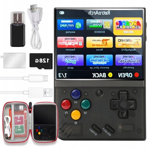 - 🎮 【Lista opakowań】: konsola do gier Miyoo Mini Plus x1, torba do przechowywania x1, karta pamięci 128G x1, folia hartowana x1, kabel do transmisji danych typu C x1, czytnik kart x1, instrukcja obsługi x1.