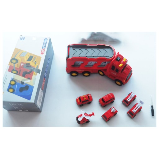 - 🚒 - 【ZABAWKA 7 W 1 CIĘŻARÓWKA】 - Zaprojektowana dla entuzjastów małych strażaków, zawiera większy pojazd transportowy i 6 małych samochodów (samochód strażacki, ciężarówka z drabiną, helikopter, zraszacz, samochód i SUV). Pracującą część tych pojazdów strażackich można przesuwać, co sprawi, że Twój mały bohater poczuje, że misja ratunkowa jest przeprowadzana w sposób bardziej iście zabawkowy dla chłopców w wieku 3-5 lat.