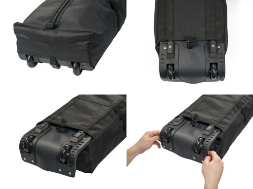 Dla maksymalizacji komfortu transportu nart - zaopatrzyliśmy nasz pokrowiec w wygodne kółka ulokowane w specjalnym panelu. Robotę robi to, że jest on wysuwany i możemy go opcjonalnie zakładać bądź wyjmować - jeżeli przewidujemy, że kółka nie będą nam potrzebne to wysuwamy cały panel, odkładamy na półkę w garażu i zmniejszamy tym samym jeszcze bardziej i tak niską wagę pokrowca. Kiedy będziemy mogli wozić pokrowiec na kółkach za nami - pozostawiamy panel z kółkami zainstalowany w pokrowcu i transport sprzętu staje się bajką! Od teraz nie musisz już nadwyrężać swoich mięśni i możesz tym samym zostawić sobie więcej siły na szusowanie, aniżeli dźwiganie nart.