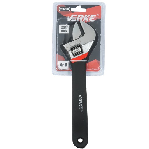 Klucz nastawny wykonany ze stali chromowo-wanadowej (CR-V). Zastosowany chrom gwarantuje odporność stali na korozję, utlenianie, ścieranie i dużą wytrzymałość w wysokiej temperaturze, zaś dodatek wanadu również wpływa na odporność na działanie wysokich temperatur oraz nieuleganie deformacjom. Miarka wypalona laserowo gwarantuje czytelność bez obaw o zatarcie się skali. Rękojeść pokryta tworzywem odpornym na działanie oleju i smarów.