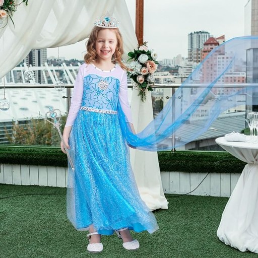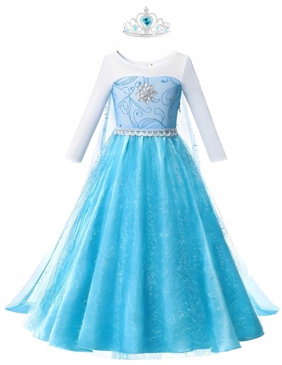 ⭐️ Przepiękny kostium ELSY na bal karnawałowy. Sukienka z akcesoriami prosto z kinowego hitu Śnieżna Kraina - ELZA. Strój świetnie odwzorowuje podobieństwo sukni Elsy. Kostium został starannie uszyty z połyskujących i błyszczących materiałów. Na gorsecie zostały przyszyte błyszczące brylanciki w kształcie płatka śniegu, a rękawy uszyte z delikatnej białej mgiełki. Dół sukni uszyty został z 2 warstw: pierwsza to połyskujący materiał, a druga prześwitująca srebrzysta tkanina. Dodatkowo do zestawu został dołączony tren, który mieni się pięknymi cekinami.