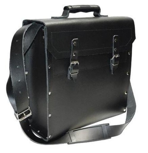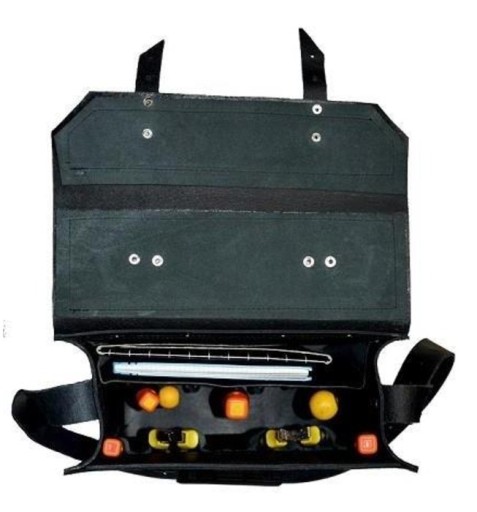- Dno torby narzędziowej wyłożone jest plexą pokryta dwustronnie blachą, materiał z którego wykonana jest rączka to skóra w połączeniu z PCV, zapinane na sprzączki, pas nośny wraz z naramiennikiem w całości wykonany ze skóry z możliwością regulacji.