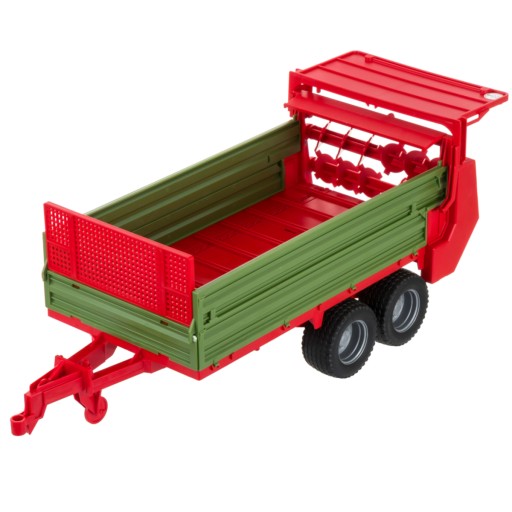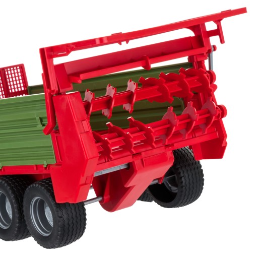 Rozrzutnik obornika to niezwykle praktyczne i funkcjonalne narzędzie. Jego zalety wynikają z precyzyjnej konstrukcji i zastosowanych mechanizmów, które pozwalają na efektywne rozprowadzanie materiału. Walec, będący integralną częścią rozrzutnika, porusza się w sposób synchronizowany z ruchem pojazdu, gwarantuje to równomierne rozłożenie obornika. Dużym udogodnieniem jest łatwość podnoszenia pokrywy rozrzutnika, co umożliwia wygodne napełnianie go materiałem oraz przeprowadzanie wszelkich niezbędnych czynności konserwacyjnych i serwisowych. Warto zwrócić uwagę na realistyczne opony z bieżnikiem, które zostały zamontowane na rozrzutniku. Nie tylko nadają mu autentyczny wygląd, ale również zapewniają lepszą przyczepność i stabilność podczas pracy. Dzięki nim rozrzutnik może poruszać się sprawnie nawet po trudnym terenie. Rozrzutnik jest kompatybilny z ciągnikami z serii Profi.