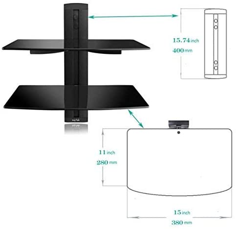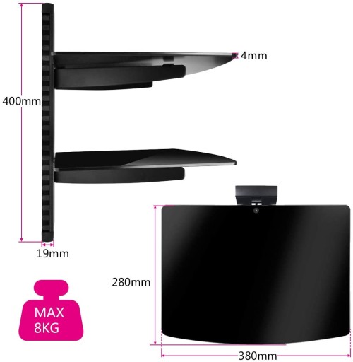 - Trwałość nasza półka naścienna jest zbudowana z jednej dużej półki ze wzmocnionego szkła hartowanego (380x280x5mm każda półka), zaprojektowana dla odtwarzaczy DVD/Blu-ray, skrzynek satelitarnych/kablowych, konsol do gier, głośników hi-fi itp.