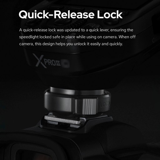 【Blokada szybkiego zwalniania】 Blokada szybkiego zwalniania została zaktualizowana do szybkiej dźwigni, zapewniając bezpieczne zablokowanie lampy błyskowej podczas używania w aparacie. Po wyjęciu z aparatu ten projekt pomaga łatwo i szybko go odblokować.